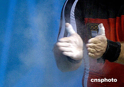 圖為在當(dāng)?shù)貢r間8月23日舉行的男子94公斤級比賽中,一選手上臺的鏡頭。