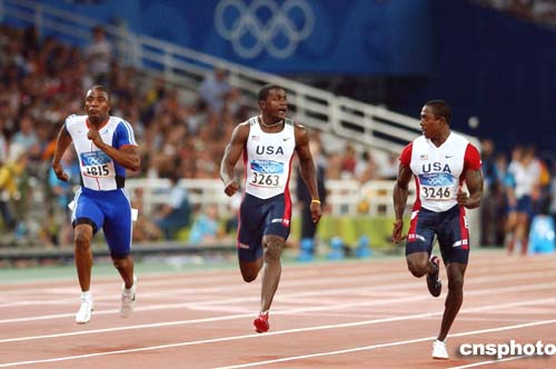在當?shù)貢r間22日進行的男子100米半決賽中,美國選手Justin Gatlin和Shawn Crawford一邊比賽,一邊交談。