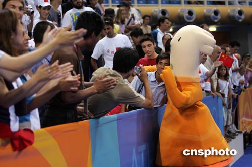 當(dāng)?shù)貢r(shí)間八月二十三日下午,在雅典奧運(yùn)乒乓球賽場(chǎng),中國(guó)觀(guān)眾與吉祥物“費(fèi)沃斯”親密接觸。中新社記者:毛建軍