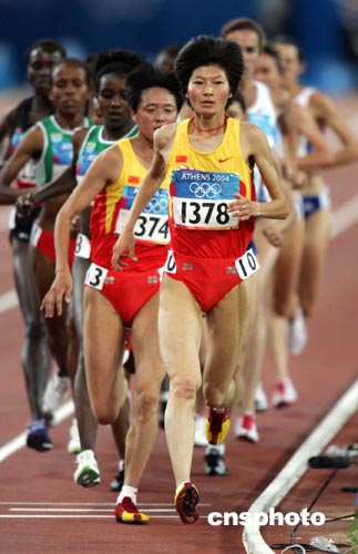 當(dāng)?shù)貢r(shí)間八月二十三日晚,在雅典奧運(yùn)女子五千米跑決賽中,孫英杰(左)和邢慧娜僅僅獲得第八和第九名。沖金希望破滅。圖為邢慧娜在領(lǐng)跑。中新社記者:毛建軍