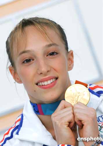 在當(dāng)?shù)貢r間23日進(jìn)行的女子體操個人器械比賽中,霍爾金娜出現(xiàn)重大失誤,法國選手勒配內(nèi)奇取得高低杠項目的金牌。圖為她向觀眾展示金牌的鏡頭。