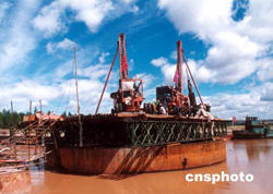 8月下旬,中鐵十四局集團三公司的工人們在呼準鐵路黃河特大橋施工現(xiàn)場加緊作業(yè)。呼(呼和浩特)準(準格爾)鐵路全長117公里,它的建設將為中國重要的能源工業(yè)基地----鄂爾多斯市的煤炭資源運輸開辟可靠的渠道,促進內(nèi)蒙古西部地區(qū)的經(jīng)濟發(fā)展。呼準鐵路黃河特大橋是全線重點工程,主體工程預計2005年10月底完成。作者:孔祥文