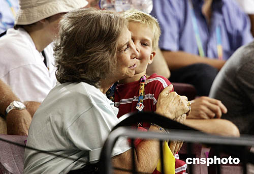 圖為西班牙皇后索菲亞與她的孫子在觀看西班牙隊(duì)和德國(guó)隊(duì)的手球比賽。