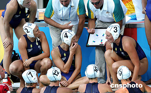 圖為在女子手球比賽現(xiàn)場,教練在現(xiàn)場部署戰(zhàn)術(shù)。最后希臘隊?wèi)?zhàn)勝澳大利亞隊挺進決賽。