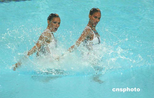 當(dāng)?shù)貢r(shí)間8月24日晚,埃及隊(duì)在雅典奧運(yùn)會進(jìn)行雙人花樣游泳比賽。中新社記者:王瑤
