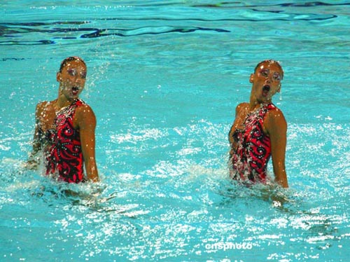 當(dāng)?shù)貢r間8月24日晚,埃及隊(duì)在雅典奧運(yùn)會進(jìn)行雙人花樣游泳比賽。中新社記者:王瑤