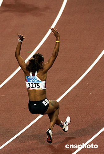 圖為獲得女子百米欄的美國選手海斯·喬安娜(HAYES Joanna)在沖過終點(diǎn)后的鏡頭。