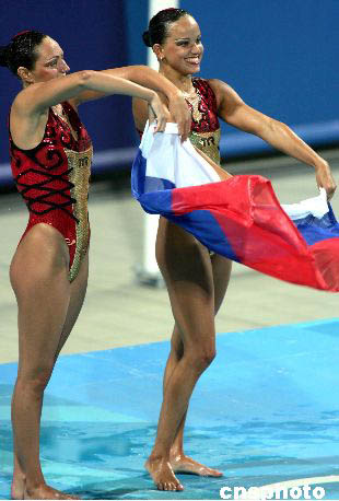 當?shù)貢r間8月25日晚,在雅典奧運會花樣游泳決賽中,俄羅斯選手以完美的表演和極具感染力的藝術(shù)氣質(zhì)毫無爭議地獲得冠軍,登上奧運會最高領(lǐng)獎臺。中新社記者:任晨鳴