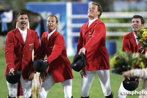 在當?shù)貢r間8月24日進行的馬術(shù)障礙賽團體賽中,德國隊榮獲第一,這是他們的隊員Otto Becker, Marco Kutscher,Christian Ahlmann和Ludger Beermaun(從左到右)慶祝的場面。