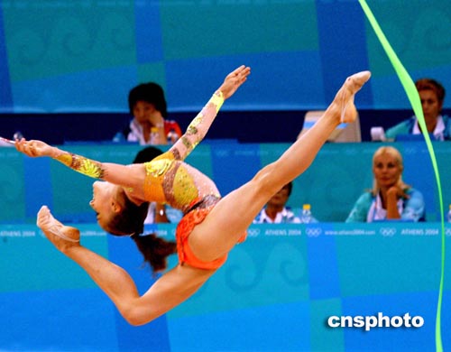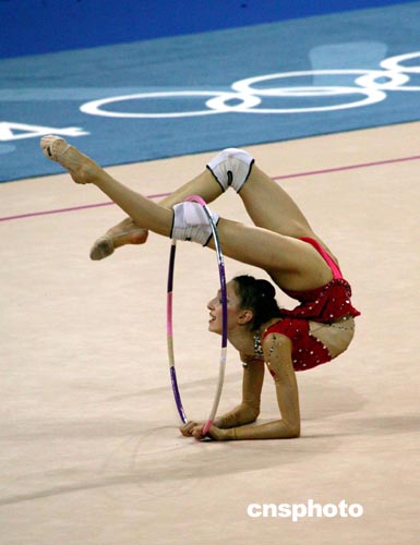 雅典當(dāng)?shù)貢r(shí)間八月二十五日,保加利亞藝術(shù)體操個(gè)人全能選手PAISIEVA進(jìn)行奧運(yùn)會(huì)賽前排練。中新社記者:王瑤