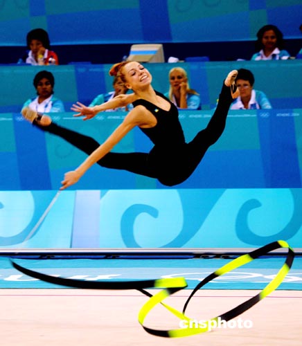 雅典當(dāng)?shù)貢r(shí)間八月二十五日,烏克蘭藝術(shù)體操個(gè)人全能選手GODUNKO.N賽前排練帶操。中新社記者:王瑤