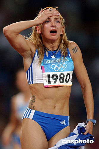 圖為希臘選手Fani Halkia在贏得女子400米欄比賽后的場景。