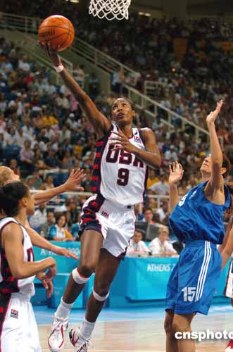 圖為當?shù)貢r間25進行的美國與希臘的女子籃球賽中,美國WNBA明星萊斯利一個漂亮的抄手上籃。