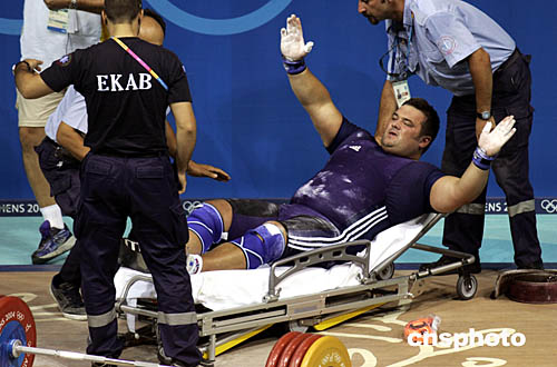 圖為挪威選手Stian Grimseth在男子105公斤級(jí)的舉重比賽中受傷被抬出場(chǎng)地的場(chǎng)面。