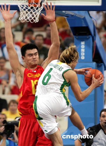 當(dāng)?shù)貢r(shí)間8月26日下午,雅典奧運(yùn)會(huì)男籃八強(qiáng)賽開戰(zhàn),暴冷闖入八強(qiáng)的中國男籃經(jīng)過頑強(qiáng)抵抗,終因?qū)嵙Σ粷?jì)而以75比95負(fù)于世界勁旅立陶宛隊(duì)。姚明發(fā)揮出色,多次扣籃成功,砍下全隊(duì)最高的29分。中新社記者:任晨鳴