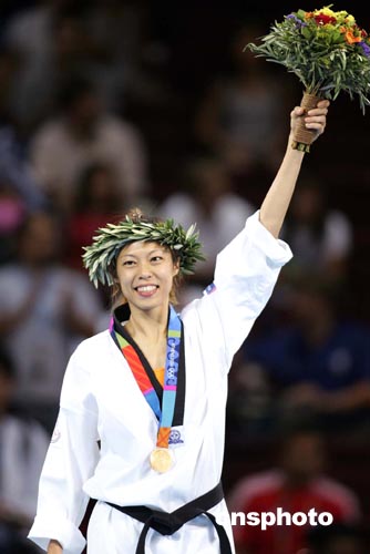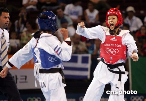 當(dāng)?shù)貢r(shí)間八月二十六日晚,在雅典奧運(yùn)會(huì)女子四十八公斤級(jí)跆拳道決賽中,中國(guó)臺(tái)北選手陳詩欣獲得金牌。這是中國(guó)臺(tái)北代表團(tuán)在奧運(yùn)歷史上的首枚金牌。中新社記者:毛建軍