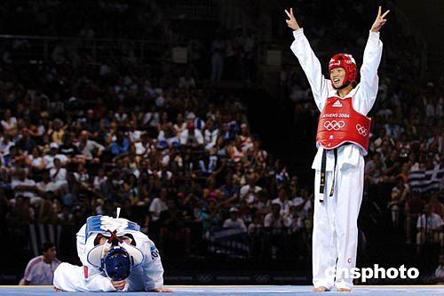 圖為在當(dāng)?shù)貢r(shí)間8月29日舉行的女子67公斤級(jí)的跆拳道比賽中,中國(guó)選手陳中擊敗法國(guó)選手為中國(guó)隊(duì)奪得第32枚金牌。