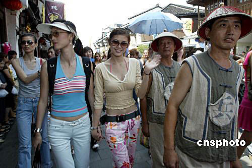 | 8月30日,參加2004年新絲路世界模特大賽的二十九個國家和地區(qū)的四十多名選手齊聚浙江省杭州市,開始她們的時尚杭州之旅,大賽組委會組織參賽佳麗們游覽西湖、乘船沿運河觀光,逛杭州著名的河仿街和絲綢城,夜晚竹海漂流,使模特們進一步貼近杭州,貼近市民生活。大賽決賽將與9月5日在杭州舉行。中新社記者 盛佳鵬 攝