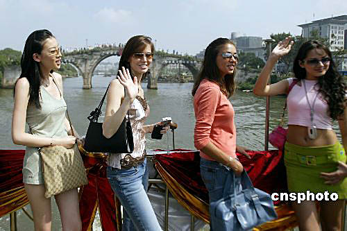 世界模特大賽參賽佳麗游覽杭州 參加世界模特大賽的選手乘船沿運河游覽