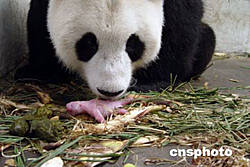 據(jù)了解,今年八月剛滿五歲的“華美”一九九九年出生于美國圣地亞哥動物園,今年二月十三日回到四川臥龍定居,它是采用人工授精技術在美國出生并存活的第一只熊貓幼仔。今年四月下旬,已是個“大姑娘”的“華美”發(fā)情后,專家們特地為“華美”找了個“如意郎君”大熊貓“靈靈”。五月二日,這兩只大熊貓成功地實現(xiàn)了本交。為增加“華美”受孕的成功機率,科研人員在本交后的幾天里又對她進行了四次人工授精!叭A美”終于成功懷孕產(chǎn)仔。