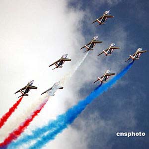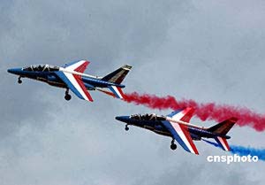 中新網(wǎng)9月7日電 日前,法國空軍飛行表演隊(duì)先遣組組長讓·馬克在北京透露,“法蘭西巡邏兵”飛行表演隊(duì)10月將隨希拉克總統(tǒng)到訪北京,在北京南苑機(jī)場舉行兩場表演,然后赴武漢、珠海、香港巡演。法蘭西巡邏兵是世界五大特級(jí)飛行隊(duì)之一,此次隨總統(tǒng)出訪是第一次。表演隊(duì)使用阿爾法噴氣教練機(jī)。此次表演由國防部外事辦公室和空軍有關(guān)單位主辦。中新社記者:鄭萍萍