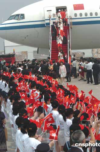 中國(guó)奧運(yùn)金牌代表團(tuán)今天上午十一時(shí)許,乘坐中國(guó)國(guó)際航空公司專(zhuān)機(jī)飛抵香港。