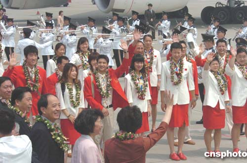 中國(guó)奧運(yùn)金牌代表團(tuán)在機(jī)場(chǎng)受到熱烈歡迎。中新社記者:錢(qián)興強(qiáng)