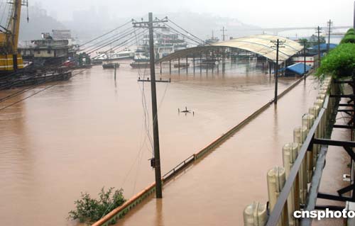 不斷上漲的江水將山城多處變成了“澤國”。在朝天門水上派出所,大門被洪水淹過一米多深,門口數百個沙袋被沖得七零八落。一青年手持叉網站在齊腰深的水中,一會兒工夫竟網起不少活蹦亂跳的魚蝦。據派出所工作人員介紹,這是朝天門廣場建成以來遭遇的最大一次洪峰。