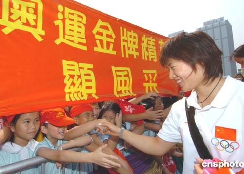 國家奧運(yùn)金牌代表團(tuán)9月7日在香港展開觀光訪問,穿運(yùn)動套裝的金牌選手乘坐旅游小巴抵達(dá)金紫荊廣場參觀,隨即繞場一周與市民握手和簽名。圖為金牌選手羅雪娟與市民親密接觸。作者:趙振清
