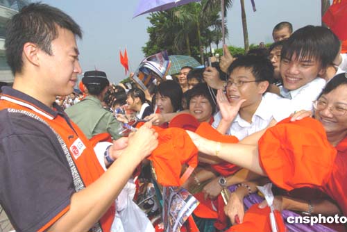 國家奧運(yùn)金牌代表團(tuán)9月7日在香港展開觀光之旅,9時(shí)45分抵達(dá)灣仔金紫荊廣場(chǎng)參觀,吸引大批市民圍觀,圖為馬琳為熱情的香港市民簽名。作者:趙振清