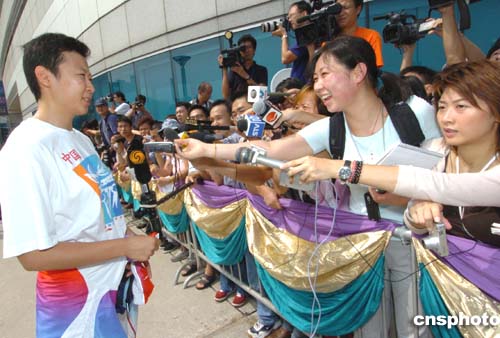 國(guó)家?jiàn)W運(yùn)金牌代表團(tuán)9月7日在香港展開(kāi)觀光之旅,9時(shí)45分抵達(dá)灣仔金紫荊廣場(chǎng)參觀,吸引大批市民圍觀,圖為女排隊(duì)長(zhǎng)馮坤現(xiàn)場(chǎng)接受媒體采訪。作者:趙振清