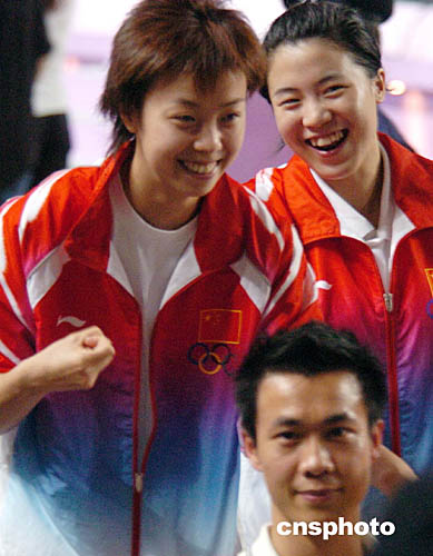為歡迎國家奧運金牌代表團訪港,九月七日香港舉行“金牌精英大匯演”,圖為奧運乒乓球金牌得主張怡寧、王楠興高采烈在“大匯演”上。中新社記者:錢興強