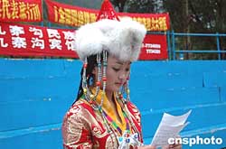 世界遺產(chǎn)四川九寨溝山靈水秀,這里的藏族姑娘如同山水一樣美麗動人。一位藏族姑娘正盛裝致辭歡迎遠道而來的游客。中新社記者:田地