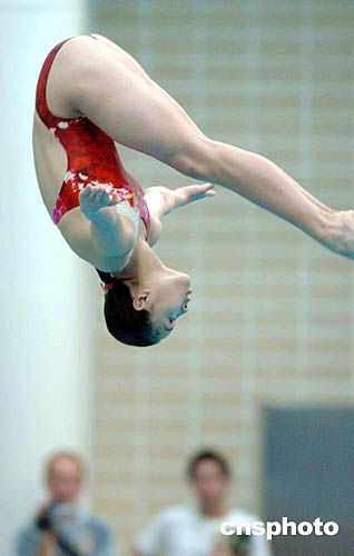 國家奧運金牌選手9月8日在香港進行最后一天訪問行程,與市民親密接觸。圖為跳水名將吳敏霞表演高臺跳水。作者:洪少葵