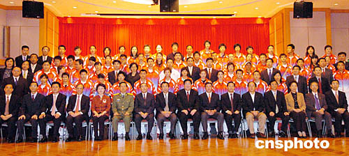 香港中聯(lián)辦九月八日晚舉行酒會,歡迎國家奧運(yùn)金牌代表團(tuán)全體成員,香港中聯(lián)辦主任高祀仁、國家體育總局局長袁偉民等出席酒會。圖為香港中聯(lián)辦官員、駐港部隊(duì)政委等與國家奧運(yùn)金牌代表團(tuán)全體成員一起合影留念。作者:錢興強(qiáng)