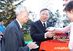 中國科學(xué)院研究生院九月九日在北京玉泉路教學(xué)園區(qū)隆重舉行了二零零四級研究生開學(xué)典禮。典禮上中科院研究生院物理科學(xué)學(xué)院、化學(xué)與化學(xué)工程學(xué)院、資源與環(huán)境學(xué)院正式成立。全國人大副委員長、中國科學(xué)院院長路甬祥院士(右)為物理科學(xué)學(xué)院院長、原國家自然科學(xué)基金委員會主任陳佳洱院士頒發(fā)聘書。作者:徐曦弋