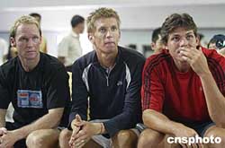 德國網(wǎng)球名將舒特勒(左一)、美國網(wǎng)球選手鄧特(左二)等在抽簽儀式上十分關(guān)注自己的對陣選手。中新社記者:盛佳鵬