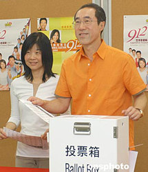 9月12日為香港第三屆立法會(huì)選舉投票日,香港財(cái)政司司長唐英年偕同夫人在港島香港仔陳白沙紀(jì)念中學(xué)投票站投票。作者:鄧慶樂