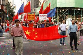 華僑華人和留學(xué)生組成了本次游行中人數(shù)最多、聲勢最浩大的隊伍,不但有舞龍、舞獅、鑼鼓,還有腰鼓、秧歌以及表現(xiàn)中國京劇藝術(shù)、少數(shù)民族服裝等傳統(tǒng)文化的表演分隊,許多路邊的觀眾也揮動中國國旗并熱烈鼓掌。