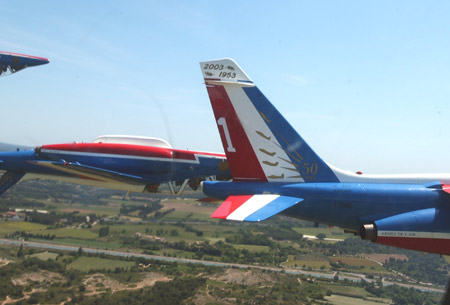 | 法國(guó)空軍的“法蘭西巡邏兵”飛行表演隊(duì)正式成立于1964年2月。飛行表演隊(duì)的飛機(jī)涂著同法國(guó)國(guó)旗一樣的紅、白、藍(lán)三種顏色,機(jī)群在空中做飛行表演時(shí)也常常把著三種顏色的煙跡留在空中。它象征著“自由”(紅色)、“民主”(白色)、“博愛”(藍(lán)色),體現(xiàn)了法國(guó)人民勇敢、浪漫的傳統(tǒng)和對(duì)未來美好的愿望。圖為飛行表演隊(duì)正在作精彩的飛行表演(來源:艦船知識(shí)網(wǎng)絡(luò)版)