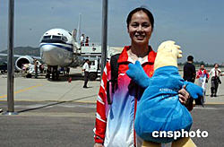 在第二十八屆雅典奧運(yùn)會(huì)上奪得女子蹦床銅牌的閩籍運(yùn)動(dòng)員黃珊汕,九月十三日攜雅典吉祥物載譽(yù)返閩抵達(dá)福州長(zhǎng)樂(lè)國(guó)際機(jī)場(chǎng)時(shí),受到福建省各界人士的熱烈歡迎。作者:劉可耕