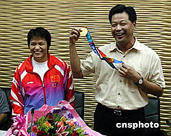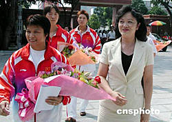 第二十八屆雅典奧運會女子柔道五十二公斤級冠軍冼東妹的家鄉(xiāng)——廣東肇慶,九月十三日下午舉行盛大的歡迎儀式,并以六十萬元人民幣重獎自己的優(yōu)秀女兒冼東妹。圖為肇慶市副市長黃玲陪同冼東妹步入會場。據(jù)悉,肇慶市委、市人民政府授予冼東妹肇慶市勞動模范、“三八”紅旗手、“肇慶市杰出青年”等榮譽稱號。同時,四會授予她四會市勞動模范、四會“三八”紅旗手、“四會市杰出青年標兵”等稱號;四會石藝國際集團贈送一套高級公寓給冼東妹。作者:黃耀輝