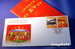 中華人民共和國第一屆全國人民代表大會第一次會議于1954年9月15日在北京召開,北京市郵票公司為配合國家郵政局于9月15日發(fā)行《人民代表大會成立五十周年》紀(jì)念郵票(1套2枚),特設(shè)計(jì)印制了該郵票的首日封(下)、郵折(上)等郵品,將與郵票同日發(fā)行。這套郵票的名稱分別為:一屆全國人大一次會議在中南海懷仁堂舉行,莊嚴(yán)的人民大會堂主席臺。兩枚郵票的面值均為80分。中新社記者:鄒憲
