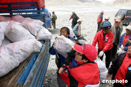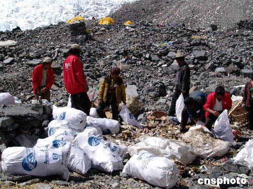 “2004地球第三極珠峰環(huán)保大行動”在珠峰展開清掃工作。作者:范曉麗