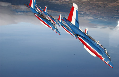 | 法國(guó)空軍的“法蘭西巡邏兵”飛行表演隊(duì)正式成立于1964年2月。飛行表演隊(duì)的飛機(jī)涂著同法國(guó)國(guó)旗一樣的紅、白、藍(lán)三種顏色,機(jī)群在空中做飛行表演時(shí)也常常把著三種顏色的煙跡留在空中。它象征著“自由”(紅色)、“民主”(白色)、“博愛”(藍(lán)色),體現(xiàn)了法國(guó)人民勇敢、浪漫的傳統(tǒng)和對(duì)未來美好的愿望。圖為飛行員們?cè)诟呖罩凶龅癸w動(dòng)作(來源:艦船知識(shí)網(wǎng)絡(luò)版)