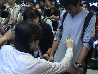 當彭坦小心翼翼的剛把腳邁出休息室走向簽售區(qū)那一刻時,還是被明眼的歌迷發(fā)現(xiàn)!疤彀。硖乖谀!”于是達達樂隊4個人基本上是飛快跑到簽售臺的,四個帥小伙的出現(xiàn)引起了現(xiàn)場不小的騷亂。人群涌動,好多小女生興奮異常。