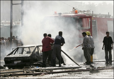 警局前的大街上布滿了玻璃碎片,上空濃煙彌漫,地上可以看到多塊尸體碎塊。警方消息稱,爆炸造成至少10人死亡,數(shù)十人受傷。