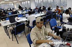 九月十四日,正在北京網(wǎng)球中心舉行的中國網(wǎng)球公開賽因雨推遲所有比賽,眾多中外記者在網(wǎng)球中心的新聞中心內(nèi)等待比賽重開。中新社記者:盛佳鵬