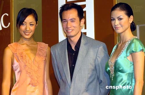 香港藝員陳豪(中)與名模蔣怡(左)﹑Rosemary14日出席香港時(shí)代廣場(chǎng)“時(shí)代b2”開業(yè)儀式。