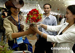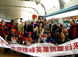 西藏自治區(qū)體育局、中國(guó)科學(xué)探險(xiǎn)協(xié)會(huì)主辦的“珠穆朗瑪峰環(huán)保大行動(dòng)”圓滿(mǎn)結(jié)束,十六日二十余名志愿者、新聞?dòng)浾唔樌祷乇本⿻r(shí),興高采烈地在首都機(jī)場(chǎng)合營(yíng)留念,祝賀活動(dòng)圓滿(mǎn)結(jié)束。中新社記者:宋吉河